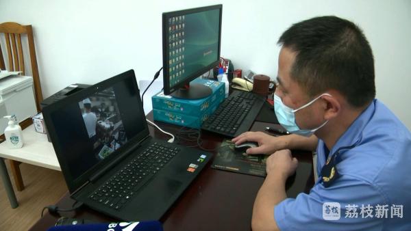 8月1日下午4点钟,正是酒店准备饭菜和分餐的时候,执法人员准时和酒店负责人进行了微信视频连线,执法人员要求酒店负责人将手机摄像头对准他们需要检查的部位。江宁区市场监管局汤山分局副局长王鹏发现有厨师没有戴好口罩,立即要求把口罩戴好。