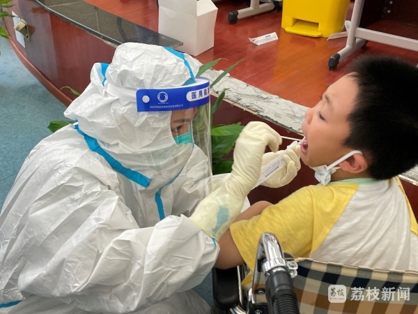 7月29日建邺区陶行知小学检测点,润玺口腔党员志愿者孙燕蹲在地上为坐轮椅的小朋友进行核酸采样。