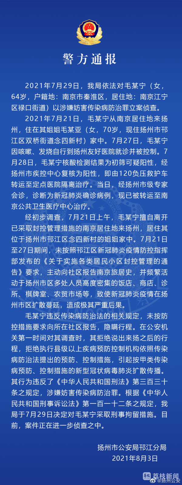 记者从警方获悉,2021年7月29日,扬州市公安部门已对毛某宁(女,64岁)以涉嫌妨害传染病防治罪立案侦查。因系新冠肺炎确诊病例,根据统一安排,毛某宁被转运至南京定点医院治疗。目前,案件正在进一步侦查之中。提醒大家:心存侥幸,造成病毒扩散,必将受到法律严惩。