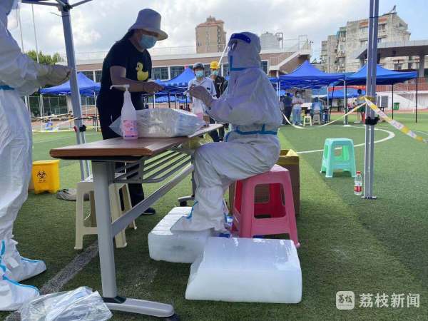 尽管天气炎热,来核酸检测的市民在工作人员、志愿者的引导下有序排队,秩序井然。现场工作人员还搬来电风扇、冰块降温,可医务人员穿着密闭的防护服,不一会儿就汗流浃背。虽然辛苦,大家仍然坚持,市民们也都非常配合,采样工作进行得非常顺利。