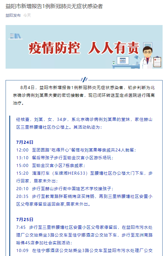荔枝新闻讯 据益阳发布”微信公众号消息,8月4日,益阳市新增报告1例新冠肺炎无症状感染者,初步判断为北京确诊病例刘某果夫妻的密切接触者,现已闭环转送至定点医院进行隔离治疗。