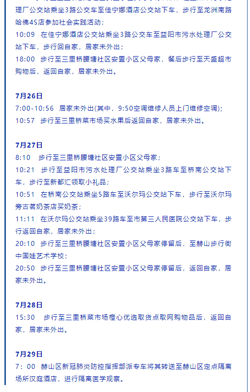 10:09 在佳宁娜酒店公交站乘坐3路公交车至益阳市污水处理厂公交站下车,步行回自家,居家未外出;