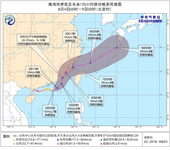 今晨5时,南海热带低压的中心位于闽粤交界西南方约355公里的南海东北部近海海面上。中央气象台预计,低压中心将以每小时10公里左右的速度向东偏北方向移动,有可能于今天白天发展为台风,并于5日下午到傍晚在广东陆丰到福建晋江一带沿海登陆,登陆后强度有所减弱,并将于7日白天移入东海南部海面,逐渐向东北方向移动。