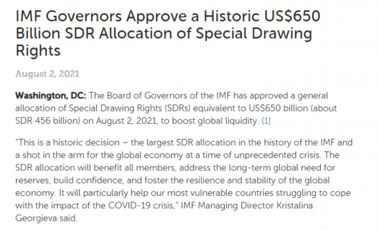IMF总裁格奥尔基耶娃表示,此次是IMF历史上规模最大的一次特别提款权分配,将为全球合力应对新冠疫情和促进世界经济复苏注入一剂“强心针”。
