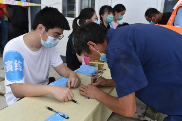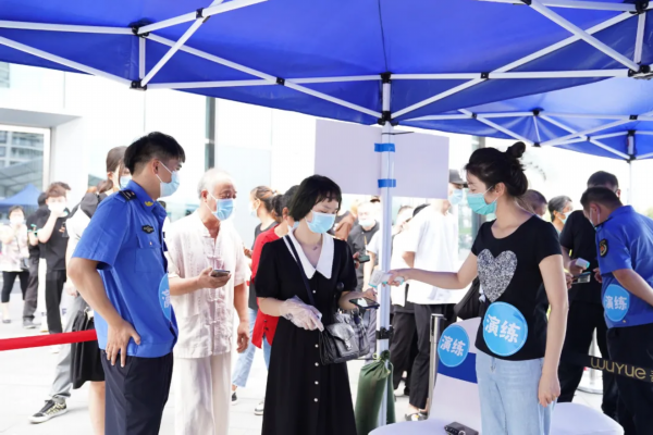 现场分为测温区、等候区、登记区、缓冲区以及样本采集区等区域,志愿者辅助现场工作人员进行苏康码、行程码检查以及测量体温,随后发核酸检测演练凭证,采集人员持卡进入内场排队进行咽拭子采样。