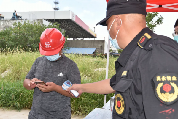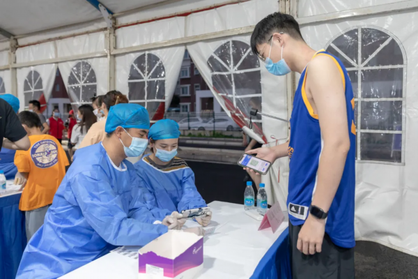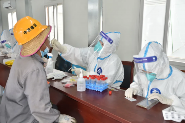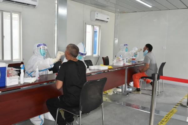 工匠之家采样点负责附近8个工地,以及工匠之家食堂超市等工作人员共计800多人的核酸采样工作。现场,来自街道、社区、物业公司的志愿者配合医务人员,引导工人们按照流程有序进行咽拭子采样。