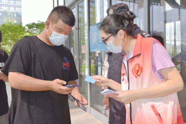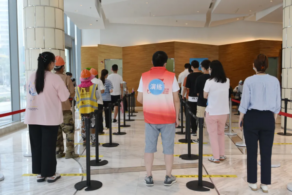大厦设置3个核酸检测点,6位医务人员分为3组,每组2人,分别负责信息登记和采样。采样结束,在核酸检测演练凭证上盖章后,采集人员有序离开演练现场。