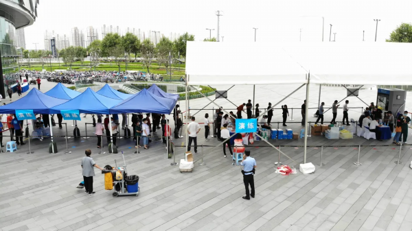 紫光大厦采样点接待来自附近楼宇的约4000名企业员工进行核酸采集,在工作人员的安排下,现场采集秩序井然、高效运转。