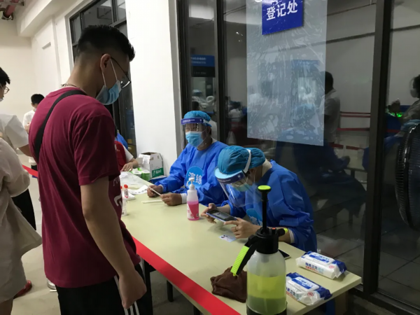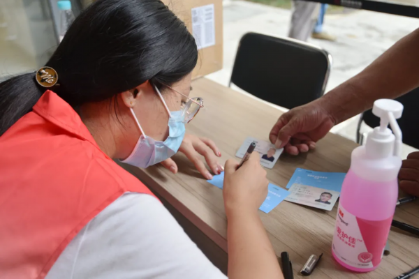 在检测入口处,市民保持一米距离,有序排队等候检测。针对老人、身份证遗失等特殊人群,现场还设置了手工登记处。