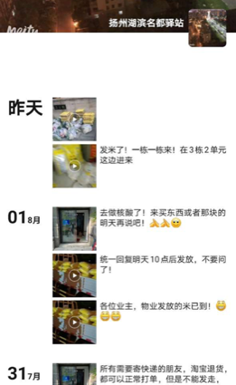 距离南京一百多公里的扬州,邗江湖滨名都菜鸟驿站站长赵祥8月2日发了一条朋友圈,“发米了!一栋一栋来!在3栋2单元这边进来。”自从7月26号快递无法进入小区后,赵祥便和物业一起给小区业主采购运送大米、鸡蛋、蔬菜等急需物资。