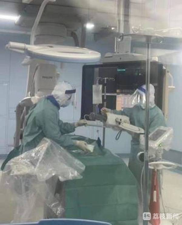 江北国际医院专家团队当机立断,决定在三级防护下进行急诊脑血管造影手术。造影手术是将细细的导丝通过大腿的血管,小心送入脑血管,需要手术医生精湛的技艺。但三级防护要求手术者穿戴防护服,铅衣、隔离服、面罩,这样一层层的“包裹”,不仅闷热异常,也使手术难度明显增加。刘主任介绍,在这样的防护下进行介入手术,就像是让穿着宇航服的宇航员穿绣花针。