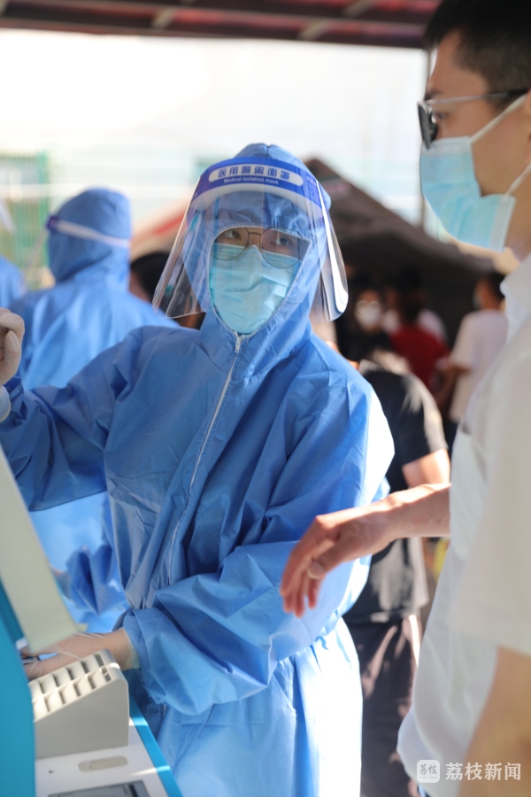 8月4日上午,在南京市六合区人民医院核酸检测自助服务通道,不少市民正在这里排队缴费,等待进行核酸检测。志愿者祁遇正穿着厚厚的防护服、带着护目镜,穿梭在排队人群中,轻车熟路地为市民开单、缴费、打印检测条码和报告。