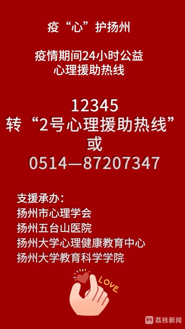 记者从扬州大学获悉,8月4日零点整,疫“心”护扬州24小时公益心理援助热线将正式开通。疫情期间,广大市民拨打“12345”转“2号心理援助热线”或拨打“0514-87207347”,即可获得免费的心理援助服务。