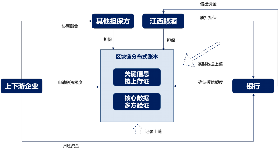 基于供应链金融区块链平台对底层资产信息的实时、可信存证,江西赣酒产品供应链中的中小微企业即可凭借链上已存证的成品酒组合成为订单合同向江西银行申请贷款。江西银行可通过平台获取经销商的库存信息、销量信息、回款信息等,可以准确判断经销商真实还款能力、精确追踪产品存量与市价核定融资额度,降低坏账风险,更好地为中小微企业提供贷款、有力支持了江西赣酒全线业务的发展。