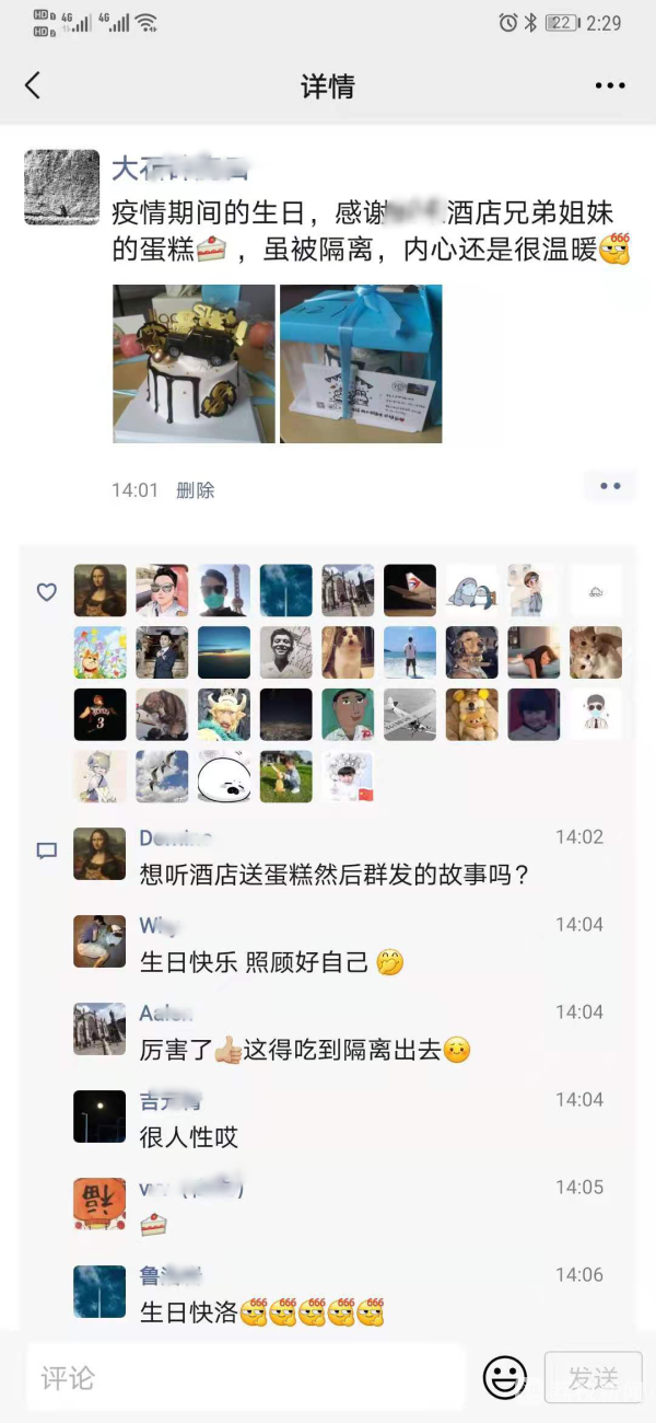 “以往过生日的时候都是和家人朋友一起度过的,本以为这次会平平淡淡的度过,没想到还能吃上生日蛋糕。”刘先生说,“这次在隔离点的‘云端’生日会将会成为我一段难忘的回忆。”