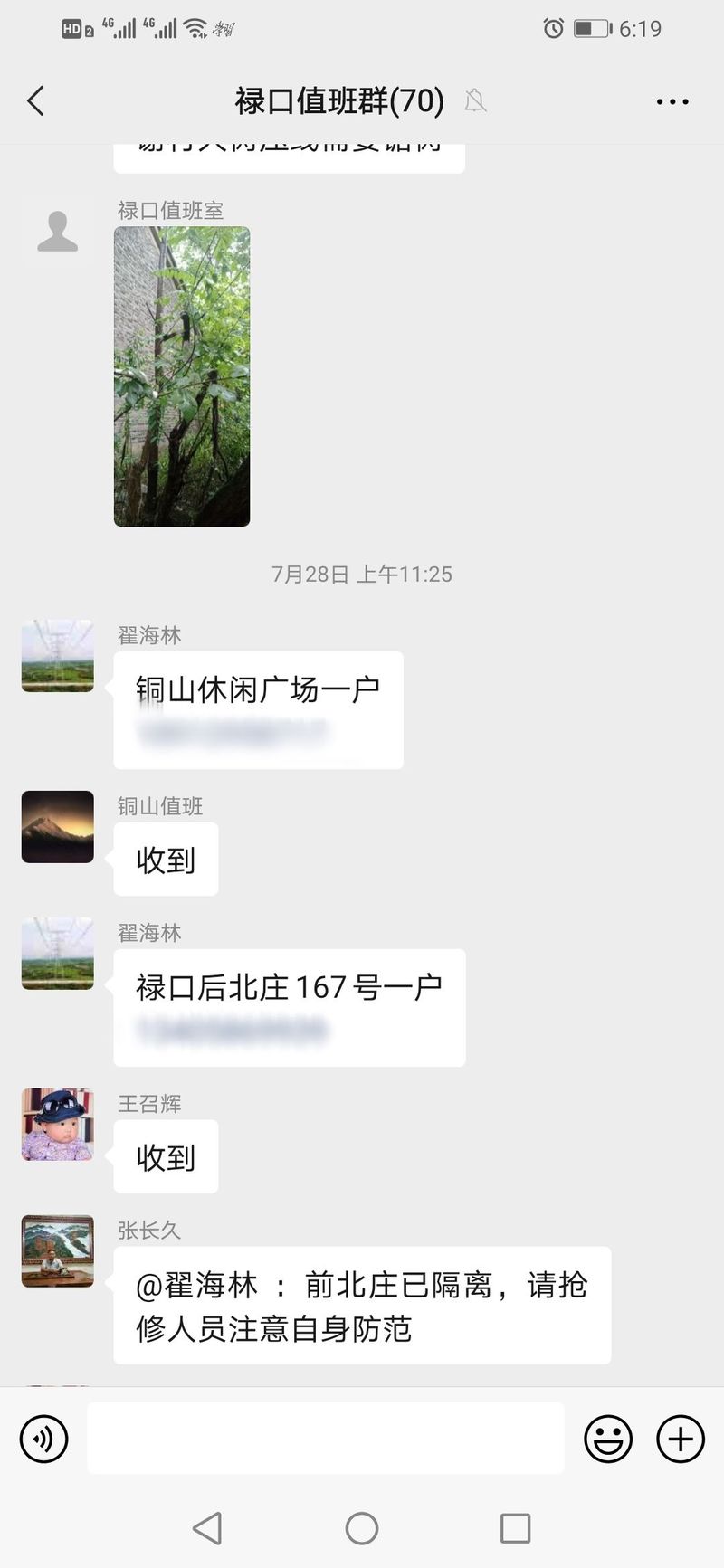 人手陡然变成原先的十分之一,但战疫没有暂停,被隔离的每一位客户经理都还在远程服务辖区客户,并密切关注着原先负责的各项工作。接到诉求电话,能在电话里指导客户解决的尽量解决,必须上门的问题再发到群里协调调度;值班人员看到信息,会第一时间安排人员上门服务。