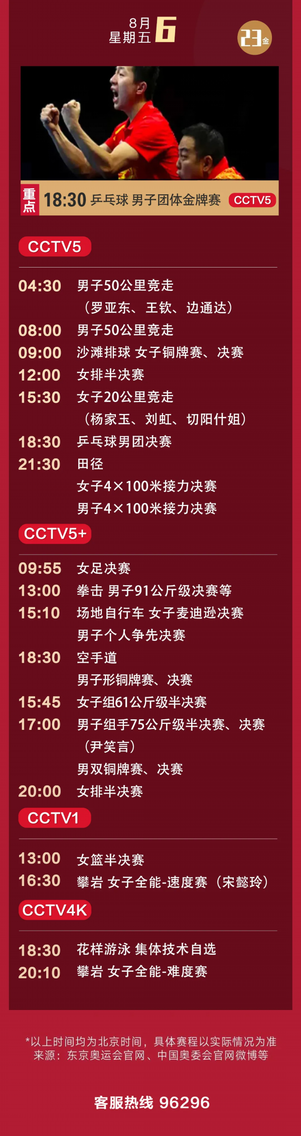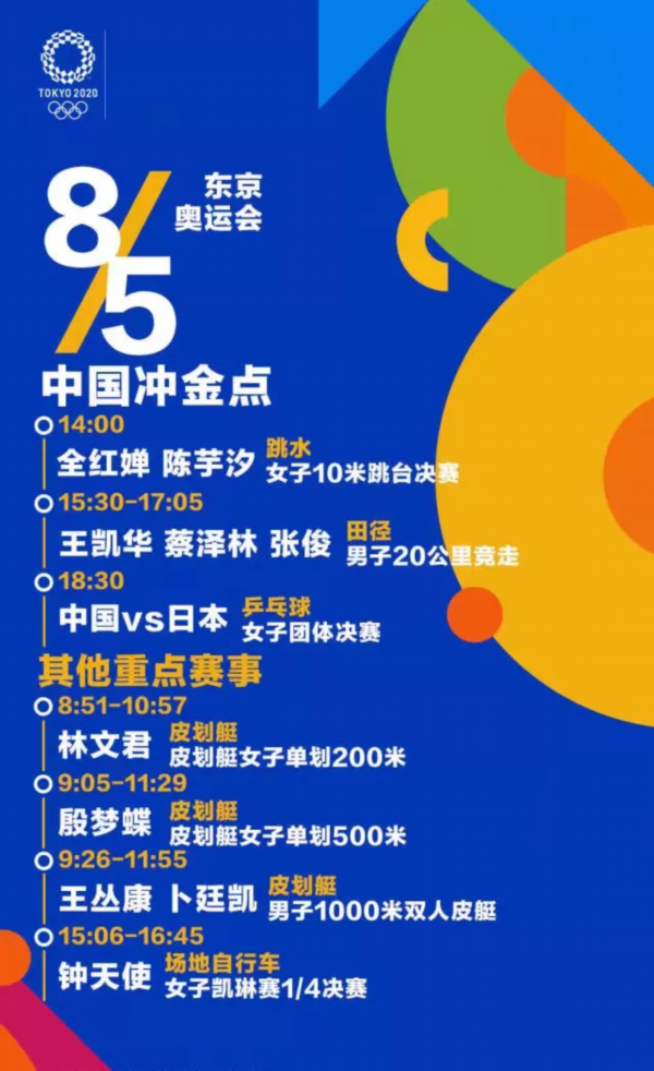 田径赛场5日将产生6枚金牌,包括引人关注的男子110米栏、男子20公里竞走。在男子20公里竞走项目上,中国选手已经连续两届奥运会拿到该项目金牌。本届奥运会,王凯华、蔡泽林、张俊三名中国选手将参加男子20公里竞走项目,其中,王凯华、张俊本赛季的成绩排名世界前三,有望实现该项目的三连冠。