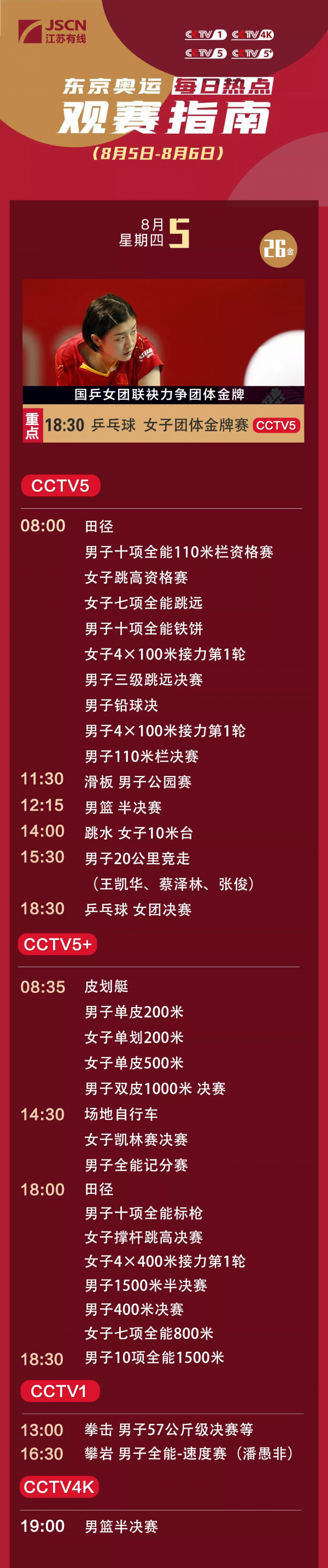5日将进行男子4x100米接力、女子4x100米接力第一轮的比赛。苏炳添、谢震业领衔的中国接力男队目标是进入决赛并且冲击奖牌,梁小静、葛曼棋、黄瑰芬和韦永丽组成的女队目标则是进入决赛。此外,郑妮娜力将继续参加女子七项全能的比赛,排名世界第4的朱亚明、方耀庆携手进入男子三级跳决赛。