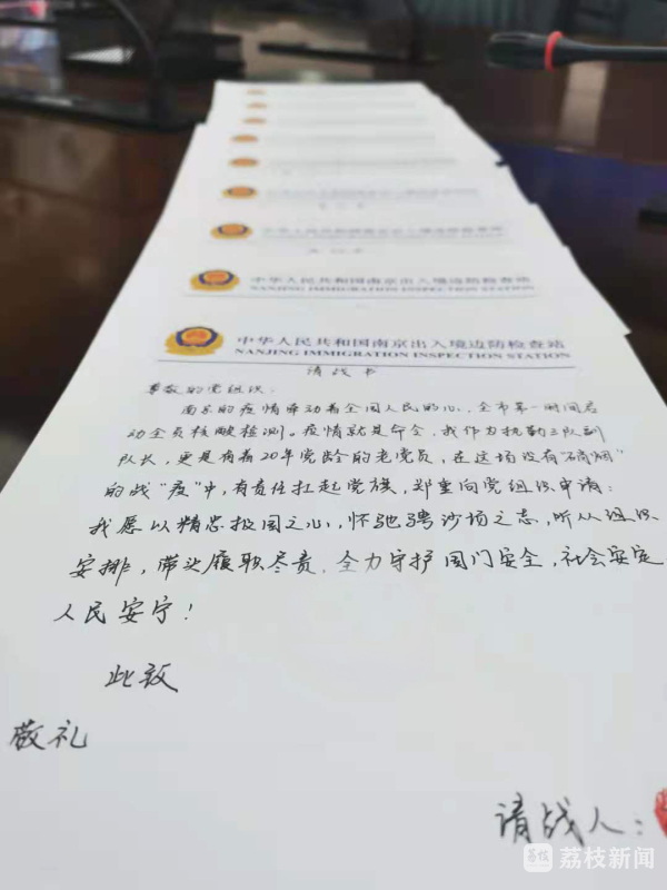 就这样陈凯连夜向党组织递交了请战书,工作群中,一份份请战书接连传来,“我年轻,让我上!”“我是老党员,我先上!”言语简单但充满力量。其中不乏家中仍有困难的党员民警,但在国门与家门面前,他们毅然决然作出无悔选择。这一夜,南京边检彻夜未眠。