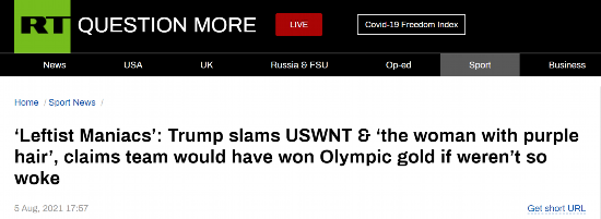 美国女足获得东京奥运会铜牌后,该国前总统特朗普的嘲讽接踵而至。据“今日俄罗斯”(RT)报道,当地时间5日,美国女足4-3险胜澳大利亚,获得铜牌。随后,特朗普特意发表声明,抨击了一番美国女足,尤其点名了自己的“宿敌”——女足队长拉皮诺。