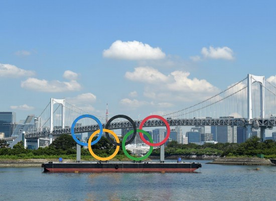 7月22日拍摄的位于东京湾的奥运五环标志。新华社记者李贺摄