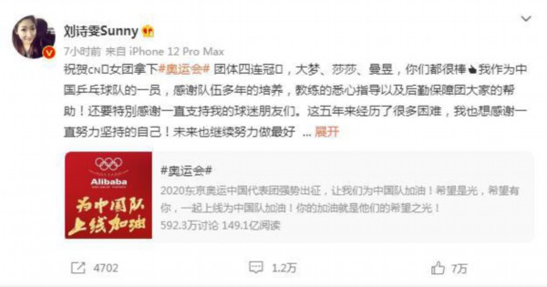 乒乓球团体决赛,中国女团3-0击败日本女团实现四连冠。随即,因伤无缘女团比赛的刘诗雯在社交媒体首度发声。