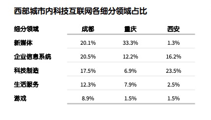 根据《报告》统计,在其定义的5种科技互联网细分领域中,成都发展更为均衡,而重庆和西安两市则有明显的偏重。在此基础上,成都在企业信息系统领域更有优势,重庆更偏向新媒体领域,而西安则在科技制造领域表现突出。