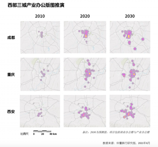 从商务楼宇的角度观察,“多中心”趋向明显出现在成渝西三市。《报告》显示,过去十年间,西部三城产业办公版图均“裂解”出新的中心,如成都的天府新区、空港新城、简州新城,重庆的两江新区、西部科学城,以及西安的高铁新城、沣东和沣西板块。据其预测,这一趋势将进一步向城市外围区域延伸。
