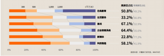 基于成都高新区、重庆两江新区照母山板块以及西安高新区三个区域的情况,《报告》统计了三市科技互联网公司承租面积在高新区内的占比。其中,在线教育、游戏、企业信息系统与科技制造四个细分领域,其承租面积超过50%均位于高新区内,特别是游戏领域,占比甚至高达近70%。