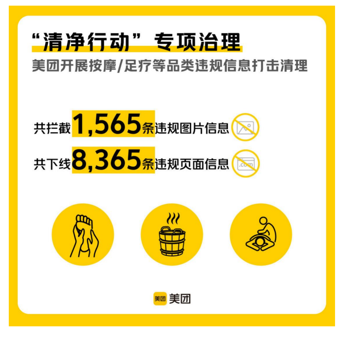 数据显示,美团此次针对足疗按摩品类的“清净行动”专项治理工作,已拦截1,565条涉低俗或诱导的违规图片信息,清理下线8,365条违规商品/店铺页面信息。