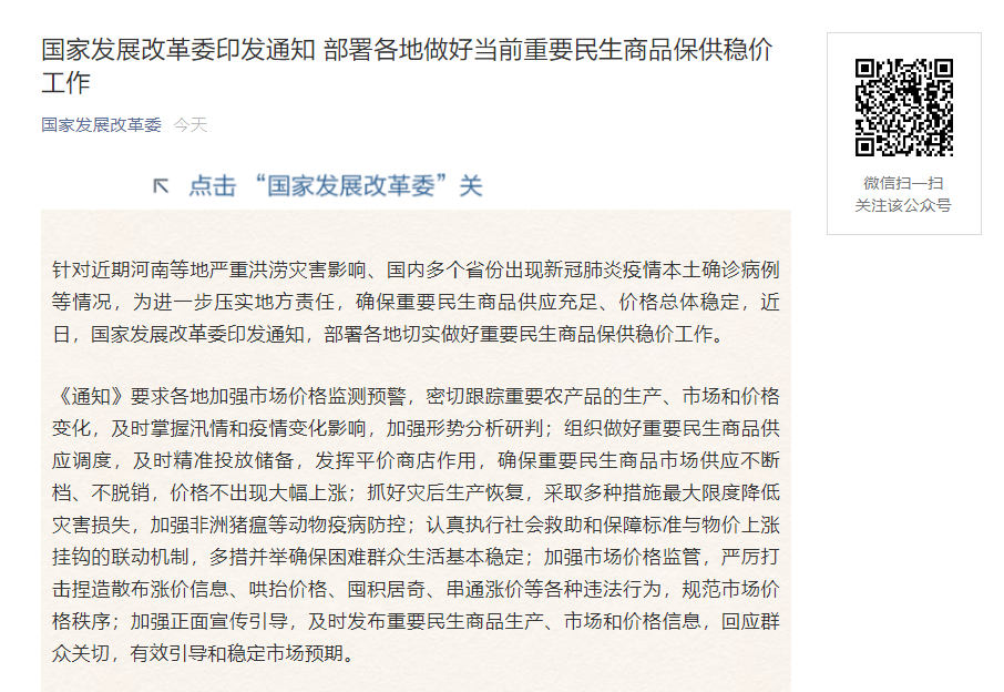针对近期河南等地严重洪涝灾害影响、国内多个省份出现新冠肺炎疫情本土确诊病例等情况,为进一步压实地方责任,确保重要民生商品供应充足、价格总体稳定,近日,国家发展改革委印发通知,部署各地切实做好重要民生商品保供稳价工作。