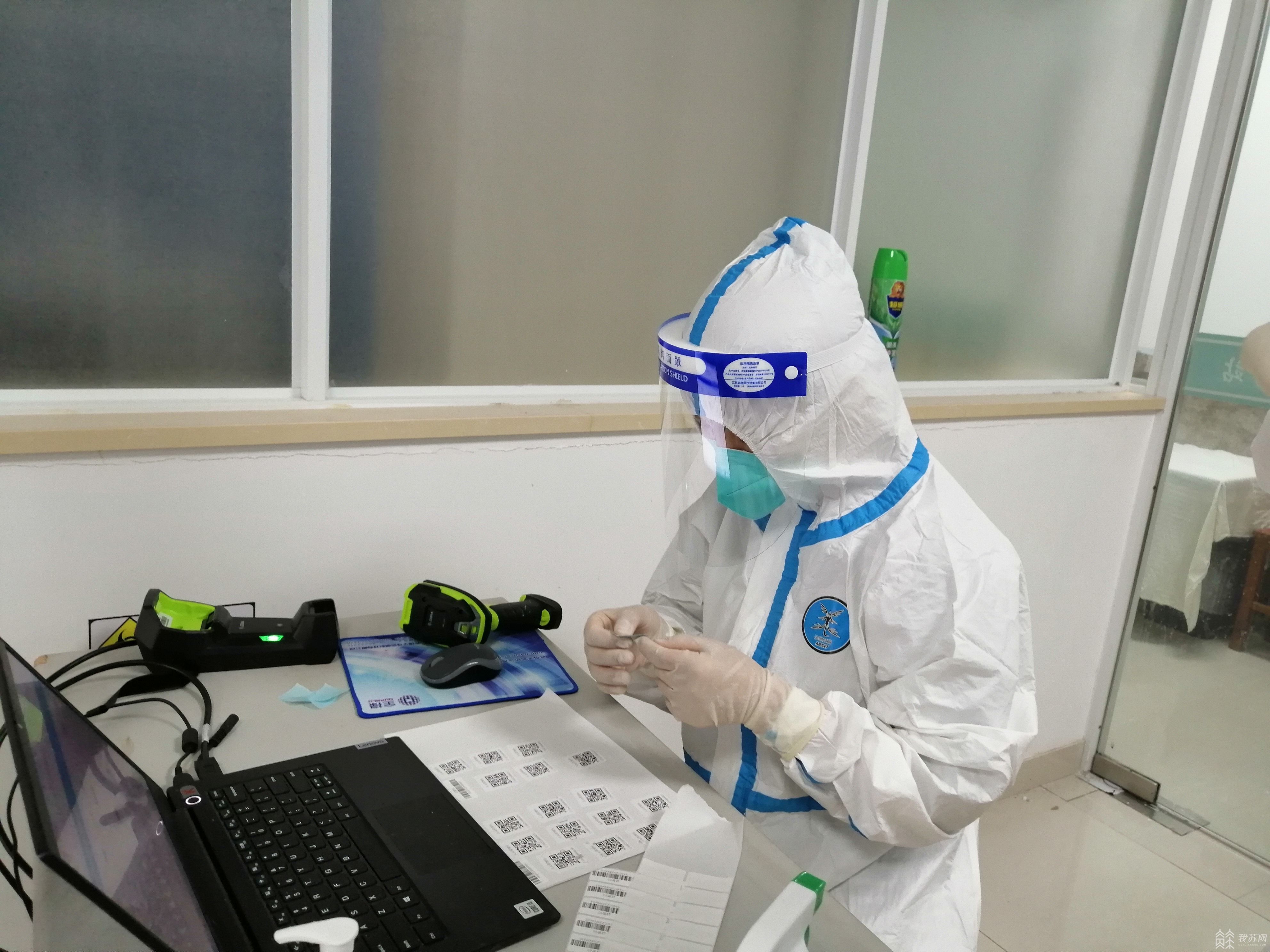 连着两天,陈春花每天从早上8点到晚上8点,持续12小时连轴作业。在检测中,陈春花的主要任务是负责人员信息核对,人员预制码与样本信息绑定,以及提醒注意个人防护等工作。她会提前一天把各种码打印好,“这项工作看似简单,但必须仔细严谨,丝毫马虎不得。”在工作过程中,一旦发现存在人员信息不匹配的情况,就要及时反馈给前一道工序的工作人员要求重新输入人员信息。