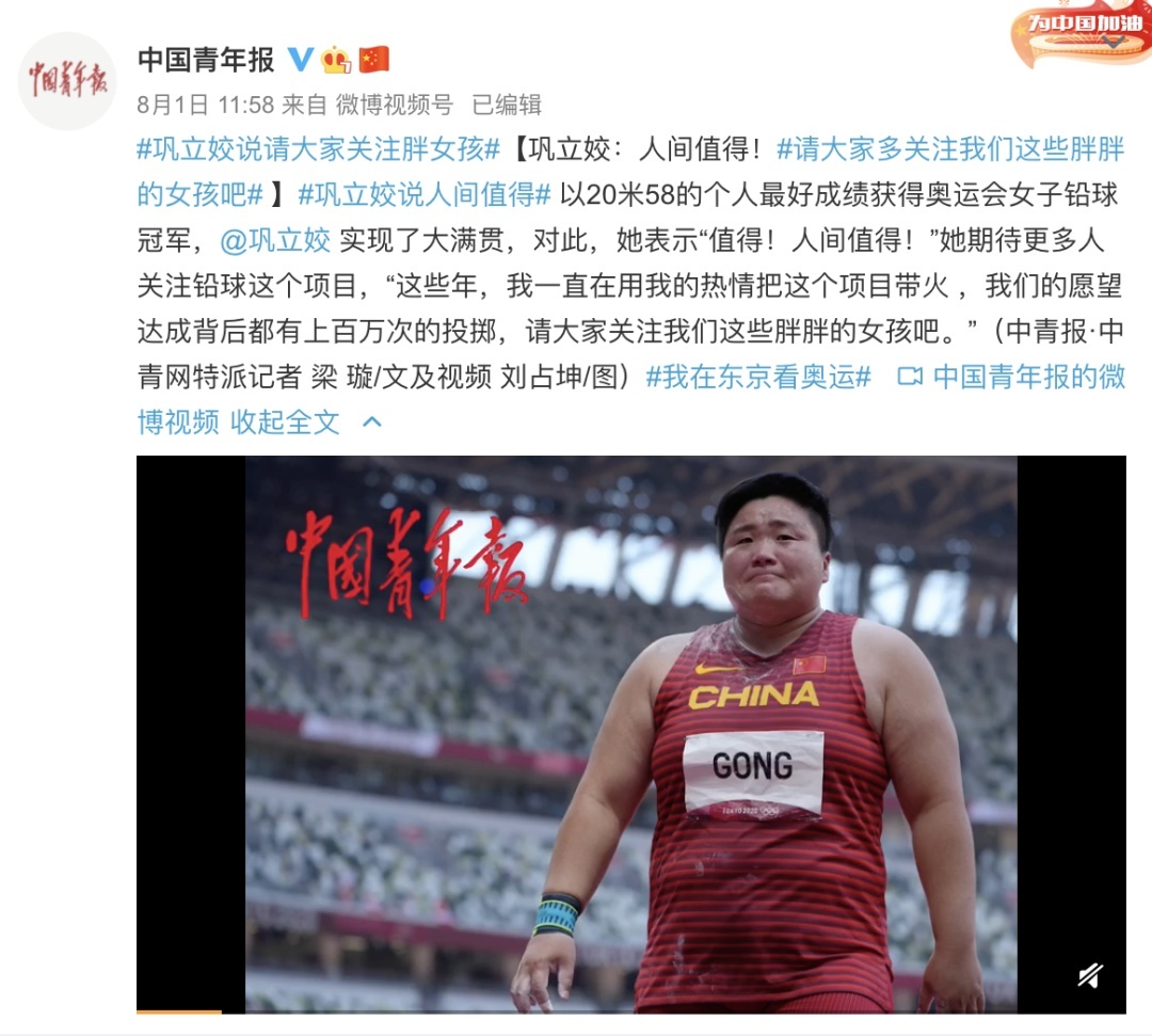 事实上,在夺冠之后,巩立姣就曾呼吁大家“多关注我们这些胖胖的女孩。”