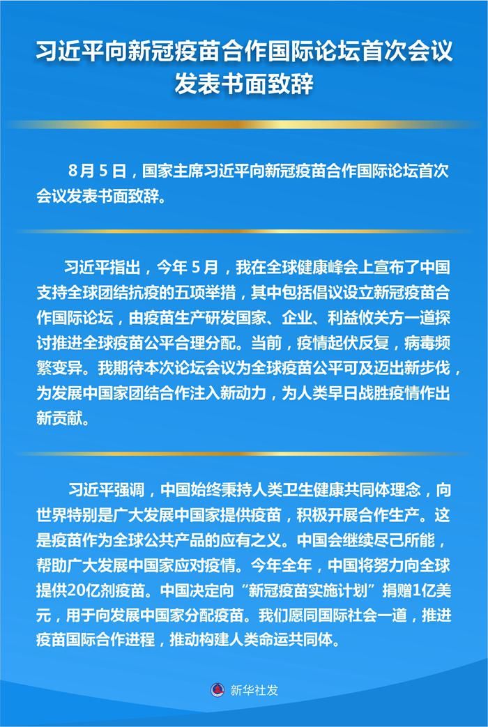8月5日,国家主席习近平向新冠疫苗合作国际论坛首次会议发表书面致辞,宣布两项重要举措:今年全年,中国将努力向全球提供20亿剂疫苗;中国决定向“新冠疫苗实施计划”捐赠1亿美元,用于向发展中国家分配疫苗。