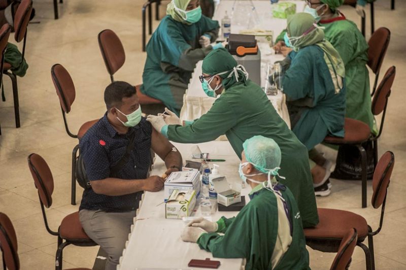 1月28日,一名医务工作者在印度尼西亚日惹接种中国科兴公司的新冠疫苗。新华社发(苏普里扬托摄)