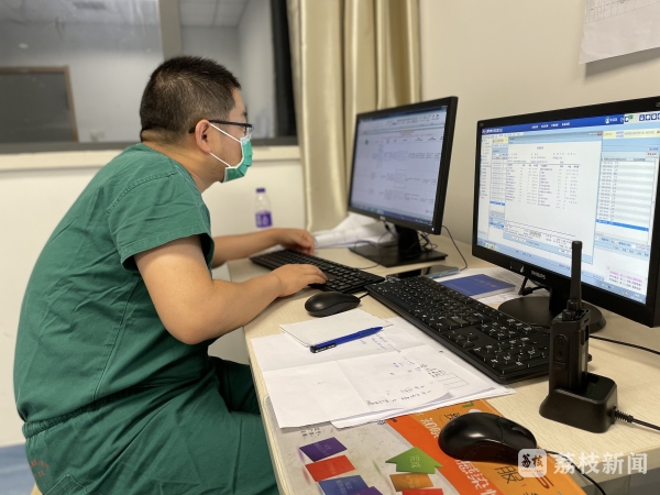 8月6日,病区开放三天,目前已接收9名患者,大多是普通型患者,也有70岁以上,有基础疾病的高龄患者。大家情绪稳定,一切已进入规范化诊疗。采集核酸、空腹抽血、测量血氧饱和度等指标、记录脉氧情况……已是凌晨2点,江苏省中西医结合医院呼吸科主治中医师苏克雷还在值班写报表。