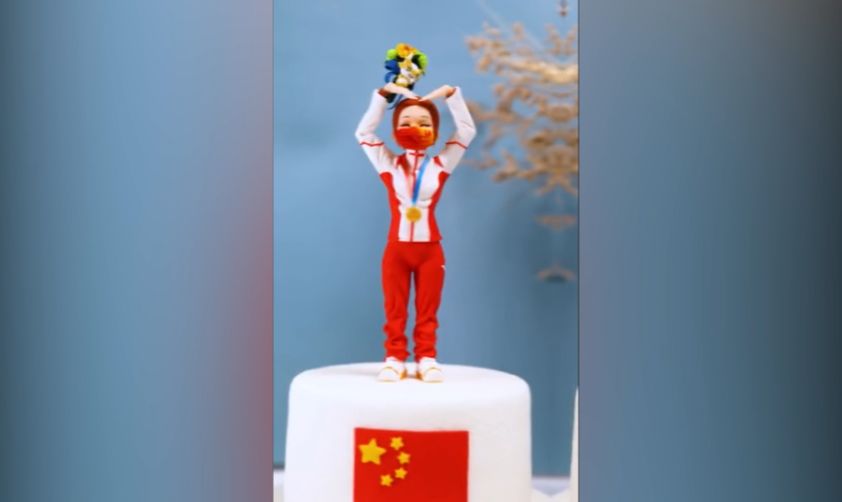 在苏州,王森教育集团的工艺系老师龚利斯,受奥运首金选手杨倩的花式比心造型启发,用手里的翻糖,制作了一个同款比心蛋糕。龚利斯用这个作品致敬中国奥运健儿,为奥运喝彩,为中国队加油。