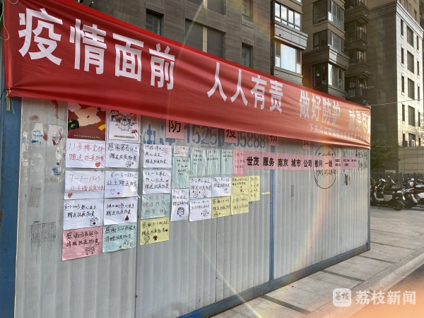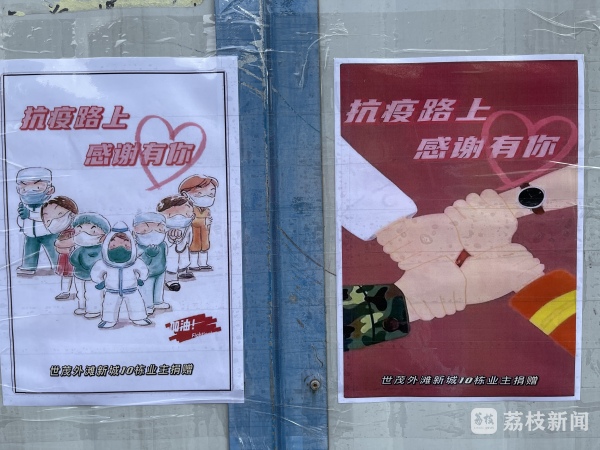 7月30日,南京市鼓楼区世茂外滩新城小区11号楼的1名保洁人员确诊,在鼓楼区防疫指挥部的统一指挥下,下关街道对整栋楼进行了封闭管理。这两天,在11号楼楼下的隔离栏外,出现了这样一面"爱心墙",上面贴满了五彩斑斓的卡片,卡片上,记录着居民们表达感激之情的暖心话语。墙里面的小屋,则摆满了业主们捐赠的饮料、矿泉水、水果等。业主们说,防疫岗的工作人员和志愿者每天24小时坚守,非常辛苦,这些物资都是业主们自发捐赠给他们的。
