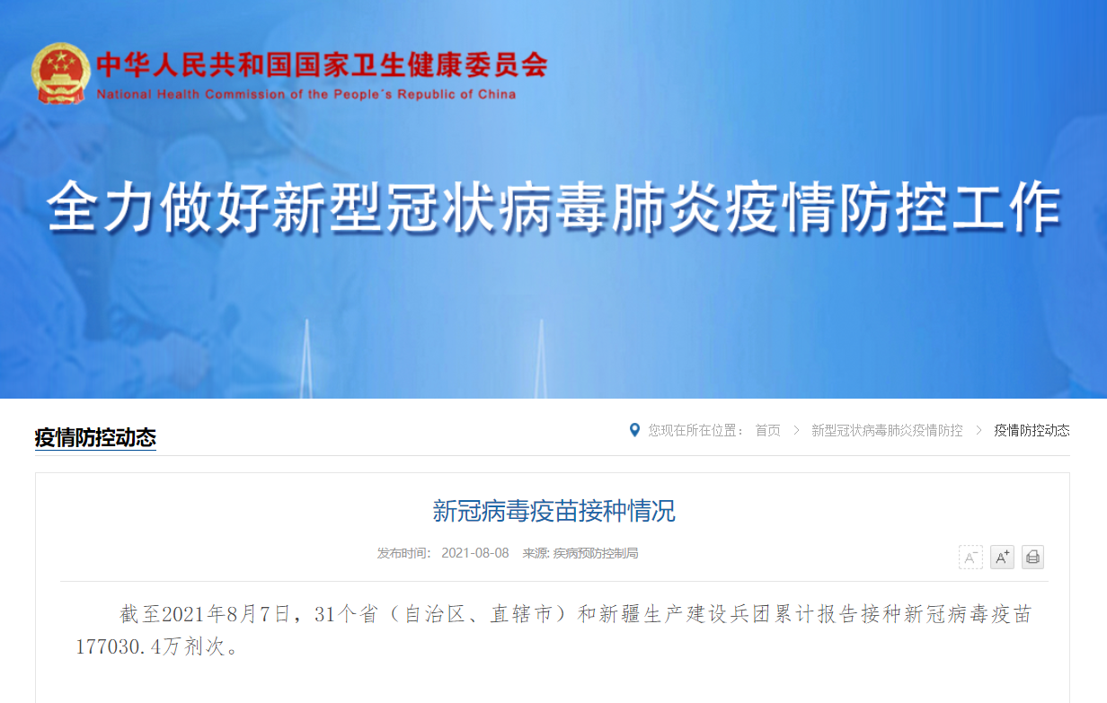 截至2021年8月7日,31个省(自治区、直辖市)和新疆生产建设兵团累计报告接种新冠病毒疫苗177030.4万剂次。