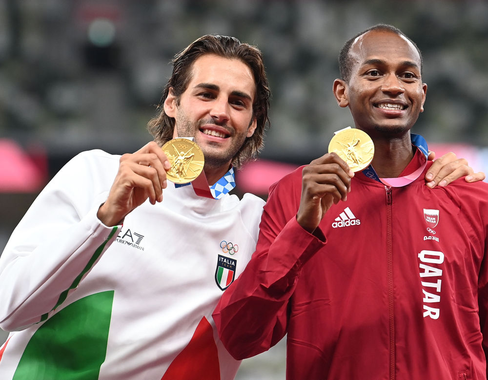 男子跳高决赛,卡塔尔选手巴希姆和意大利选手坦贝里由于最终2米37的成绩一致,实在难以决出胜负,裁判询问两人是否愿意共享金牌后,二人表示同意。经组委会商定,最终同意为他们颁发双冠军。两人先是击掌,然后紧紧拥抱在一起。此前,两个人在所有高度上都是一次过杆,在2米39两个人都没有成功,最终英雄惜英雄,英雄彼此成就。