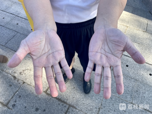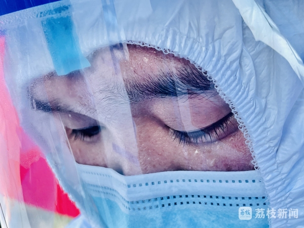 ▲早上7:20左右,工作了近3小时的两位医务人员换岗,脱下防护服,他们的衣服已被汗水淋湿,手掌被捂皱变形。