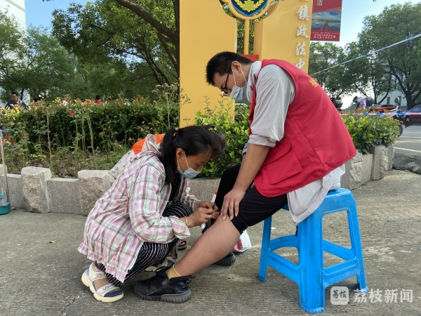 ▲新祥村20岁的准大学生志愿者王雨辰在搬运医疗保障物资的时候不慎摔倒,图为妈妈为其包扎伤口。