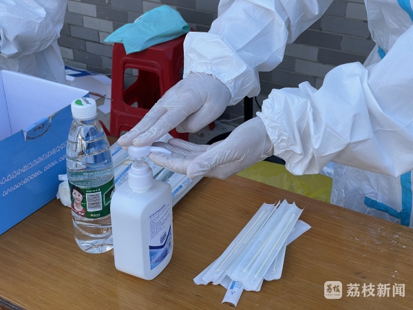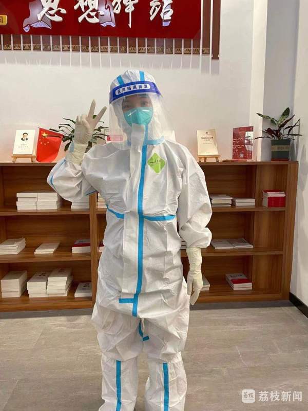 ▲早上4:40,来自市三院的护士在盐渎书城采样点换好防护服准备“上阵”。
