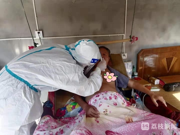 ▲同港村核酸检测演练现场,学富卫生院医生蔡雨身穿防护服帮助全村村民进行核酸检测,汗水打湿了脸庞。