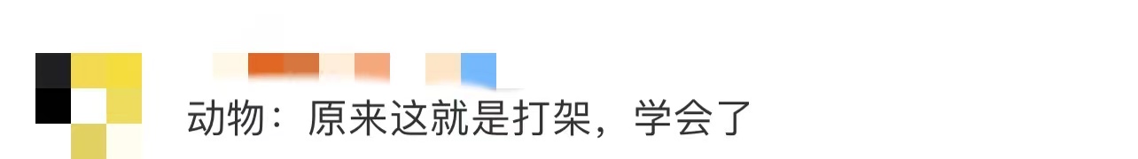 另据内部人士透露,双方撕打地点附近的动物们是第一次看到人类之间的打斗场面,令它们印象深刻,当晚部分动物家庭在兽舍内纷纷效仿,场面一度失控,在饲养员的耐心教育下动物们知道了打架不好,特别不好。