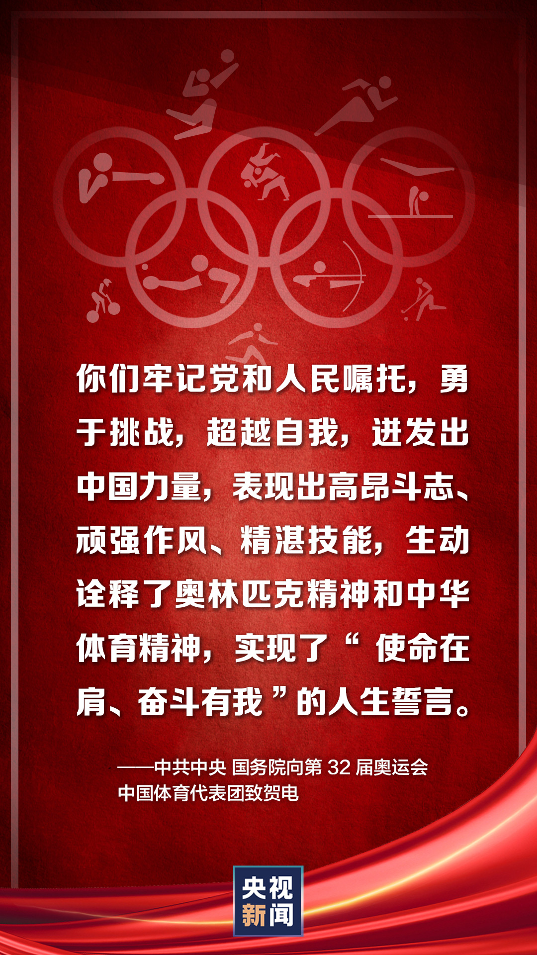 在第32届奥林匹克运动会上,全团同志表现出色,取得38枚金牌、32枚银牌、18枚铜牌的优异成绩,实现了运动成绩和精神文明双丰收,为祖国和人民赢得了荣誉。党中央、国务院向你们表示热烈的祝贺和亲切的慰问!