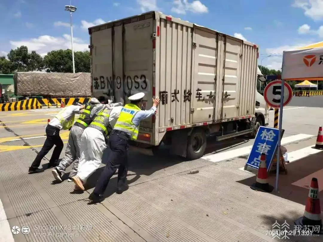 玉祁道口的另一处,玉祁城管队员在防疫检查时发现一辆白色卡车在道口突然抛锚无法启动,为避免影响交通秩序,城管队员发现后立即喊来路口交警共同将车辆推出机动车道,并帮助车主联系救援车辆。