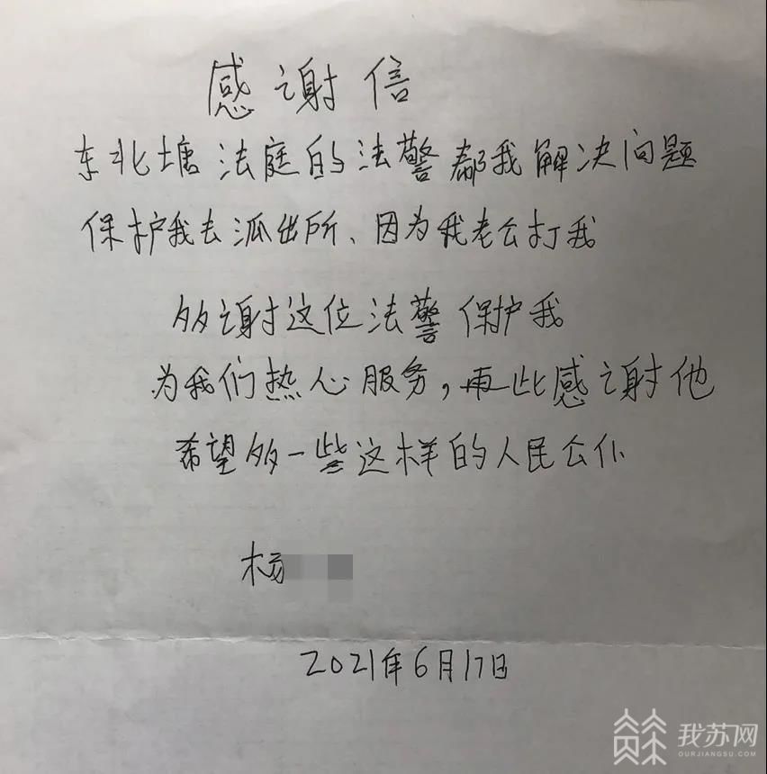等杨某情绪稳定后,姜珂通知她娘家人将她带回,随后对杨某的丈夫进行了教育,严肃告知其不能有过激行为。杨某对姜珂一再感谢,当天下午就送来了感谢信。