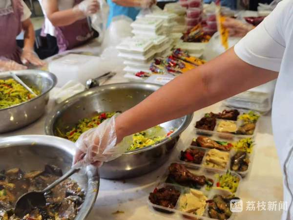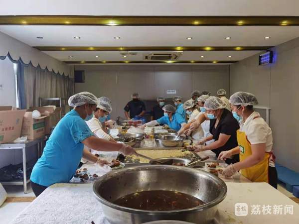 酒店总经理郜光告诉记者,这里每天要供应2000份左右的食物给浦口区、江北新区的部分隔离点以及周边一些农村、社区的核酸检测现场。为了更好地保障用餐,目前酒店已经暂停营业,发动酒店工作人员三十人,并从其他的食堂岗点调来二十多人一起参与到供餐的工作中。