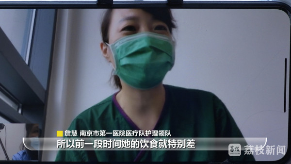 南京市第一医院医疗队护理领队詹慧说:“这个老奶奶因为是一个人被送到病房的,心理负担比较重,总认为自己熬不过去了,所以前一段时间饮食就特别差,基本上不吃,我们送去的所有饮食她都放在桌子上不吃。”